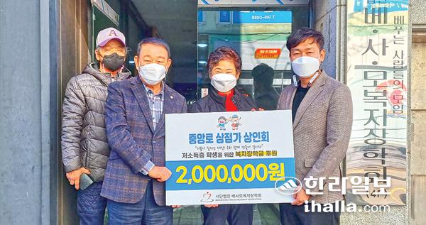 제주 중앙로 상점가 상인회(회장 양창영)는 경제적 어려움에도 불구하고 국가와 사회에 필요한 일꾼이 되기 위해 학업에 전념하는 학생들을 돕기 위해 지난 22일 (사)베·사·모 복지장학회에 200만원의 장학금을 기탁했다. 양창영 회장은 "더불어 함께 사는 세상을 만들어 가는데 앞으로도 지속적인 장학사업을 후원해 나갈 예정"이라고 밝혔다.