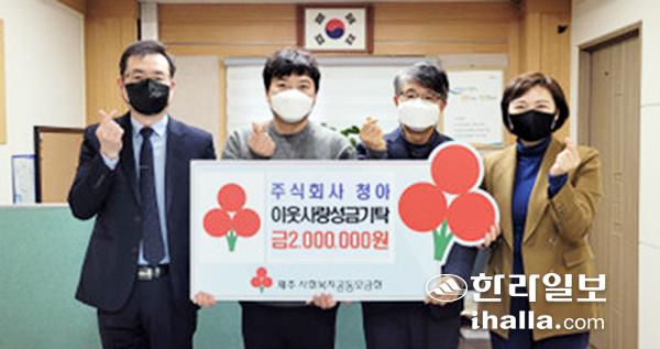 (주)청아(대표 정민호)는 지난 22일 연말연시를 맞이해 연동주민센터를 방문해 저소득 가구 아동 장학금으로 200만원을 사회복지공동모금회에 기탁했다.