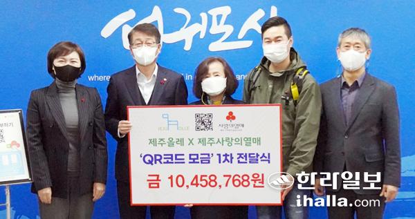 제주사회복지공동모금회(회장 강지언)는 지난 24일 (사)제주올레(이사장 서명숙)에 QR코드 모금을 통해 마련한 성금 1045만8768원을 1차로 전달했다.
