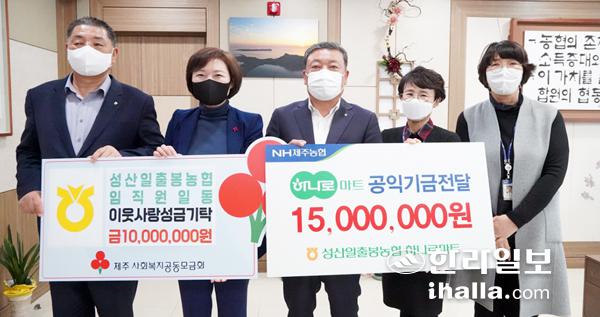 성산일출봉농협(조합장 강석보)은 최근 하나로마트 공익기금 1000만원과 임직원 성금 1500만원을 제주사회복지공동모금회(회장 강지언)에 기탁했다.