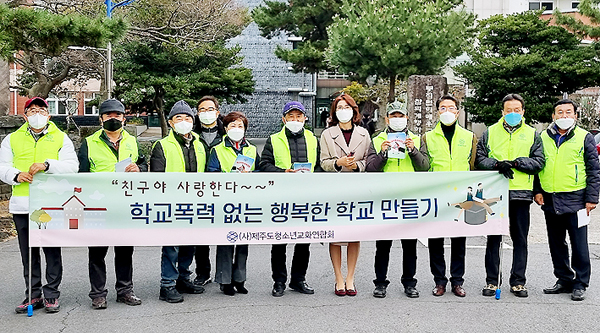 (사)제주도청소년교화연합회(회장 강덕부)는 지난 24일 제주대사범대부설고등학교 정문에서 제주도청교련 봉사회원, 학교장, 교사 등 20여명이 참여한 가운데 학교폭력 예방 캠페인을 실시했다.