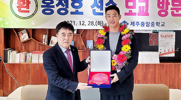 제주중앙중학교(교장 고영종)는 지난 28일 제36회 졸업생 홍정호 선수(전북현대모터스, 2021 K리그1 MVP)에게 모교 축구발전 공로와 지속적 발전기금 출연에 대해 감사패를 전달했다. 홍정호 선수는 "앞으로도 더 많은 지원을 할 수 있도록 노력하겠다"고 전했다.