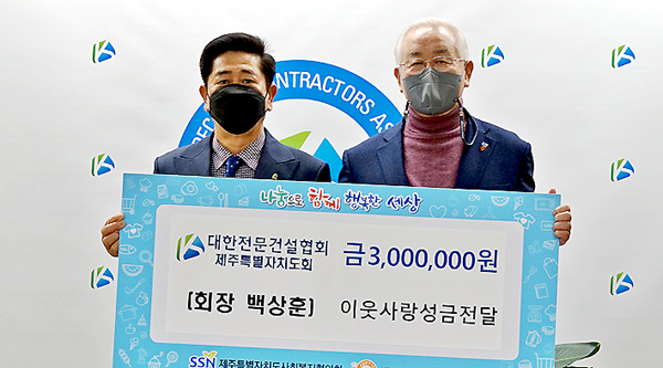 대한전문건설협회 제주특별자치도회(회장 백상훈)는 지난 28일 제주도사회복지협의회(회장 고승화)에 이웃사랑 성금 300만원을 전달했다. 이날 전달된 성금은 도움이 필요한 주변 이웃을 위해 사용될 예정이다.