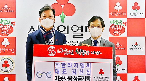(주)한라지엔씨(대표 김신성)는 지난달 31일 제주사회복지공동모금회(회장 강지언)를 방문해 2021년을 마무리하며 이웃사랑 성금 2021만원을 기탁했다.