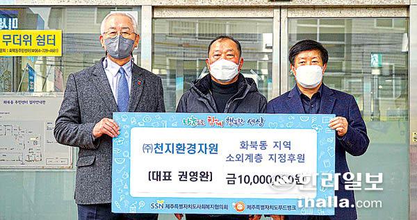 (주)천지환경자원(대표 권영완)은 최근 제주시 화북동주민센터에서 제주도사회복지협의회(회장 고승화)에 화북동 지역 소외계층 지정후원금 1000만원을 전달했다. 이번 후원금은 코로나19로 인해 화북동 지역 내 도움이 필요한 이웃에게 전달될 예정이다.