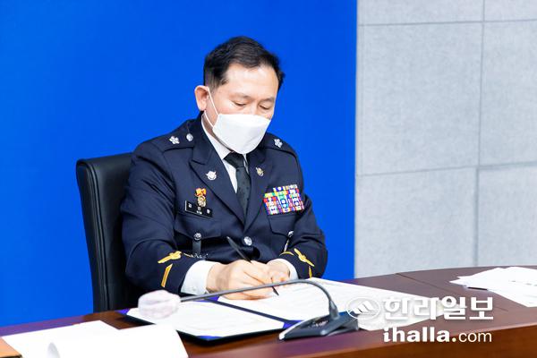 제주지방해양경찰청(청장 김인창)은 3일 열린 새해 첫 회의에서 '2022년 반부패 청렴경영 선언식'을 개최했다. 이날 선언식에서는 김인창 청장과 각 해양경찰서 서장들이 온라인으로 청렴선언서를 낭독·서명했다.