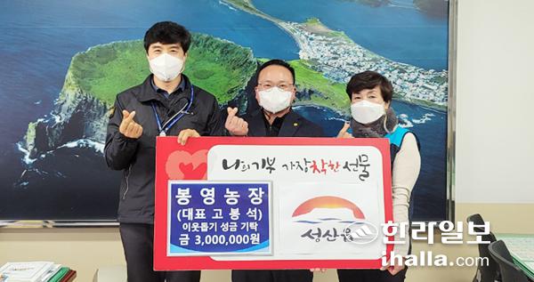 봉영농장(대표 고봉석)은 최근 서귀포시 성산읍을 방문해 겨울철 소외되고 취약한 계층을 위해 사용해 달라며 이웃돕기 성금 300만원을 기탁해 나눔과 사랑의 마음을 전달했다.