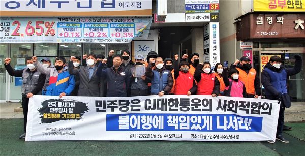 전국택배노조 제주지부는 5일 더불어민주당 제주도당사 앞에서 기자회견을 열고 항의서한을 전달했다.