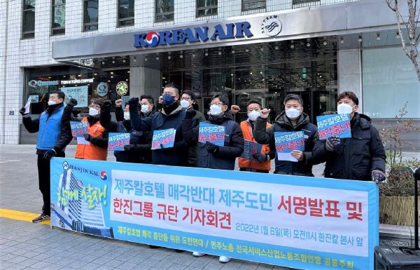 제주칼호텔 매각 중단을 위한 도민연대와 민주노총 전국서비스산업노동조합연맹은 6일 서울시 중구 한진칼 본사 앞에서 기자회견을 열고 "제주칼호텔 매각 중단하라"고 말했다. 사진=제주칼도민연대 제공