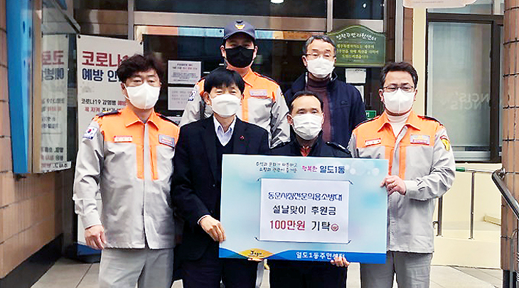 제주소방서 동문시장 전문의용소방대(대장 조광훈)는 지난달 27일 제주시 일도1동 주민센터를 방문해 설날 맞이 성금 100만원을 기탁했다.