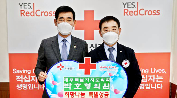 제주특별자치도의회 예산결산특별위원회 박호형 위원장은 지난달 28일 대한적십자사제주특별자치도지사(회장 오홍식)를 방문해 소외된 이웃을 위한 희망나눔 특별성금을 기탁했다. 박 위원장은 "지역사회 복지 향상에 보탬이 되고자 기탁하게 됐다"고 말했다.