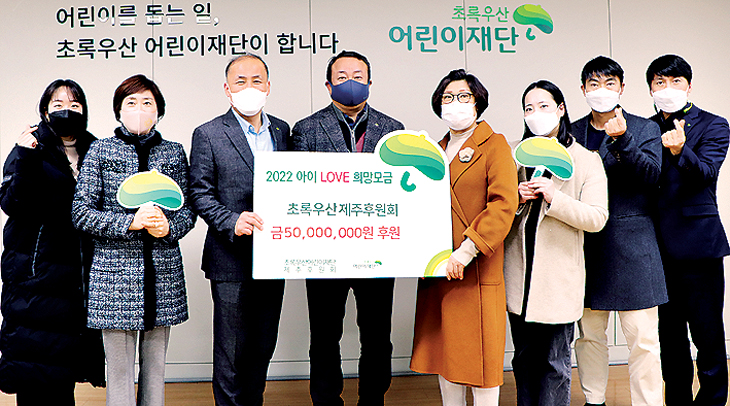 초록우산어린이재단 제주후원회(회장 장행우)는 지난달 28일 초록우산어린이재단 제주지역본부(본부장 김희석)를 통해 '아이 LOVE 희망모금 캠페인'에 참여하고 아동지원금 5000만원을 후원했다.