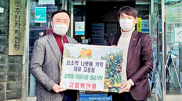 쇠소깍 나룻배 카약(대표 고종림)은 지난달 28일 서귀포시 효돈동을 방문해 이웃을 사용해 달라며 위로금 100만원을 전달했다. 고종림 대표는 "주위에 도움의 손길이 필요한 어려운 이웃을 위해 작은 마음을 담아 매년 어려운 이웃과 정을 나누겠다"고 밝혔다.