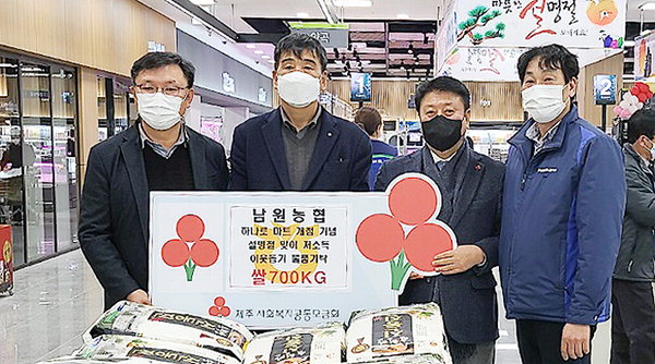 남원농협(조합장 김문일)은 지난달 26일 설 명절을 맞아 관내 취약계층을 위한 쌀 700㎏(200만원 상당)을 제주사회복지공동모금회에 전달하며 나눔을 실천했다. 이날 쌀 전달은 하나로마트 신축 개점을 기념해 마련됐다.
