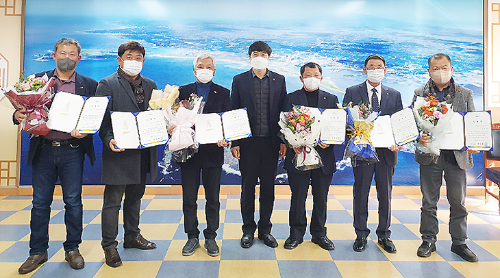 서귀포시 성산읍은 최근 읍사무소에서 신임 이장 임명장 수여식을 개최했다. 다음은 신임 이장 ▷오조리 고기봉 ▷신양리 정광숙 ▷수산1리 김문식 ▷신산리 고권섭 ▷삼달1리 강성은 ▷삼달2리 고경권 ▷신풍리 오금철.