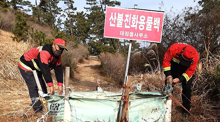 서귀포시 대정읍은 지난 8일 산불 예방장비 일제점검을 실시, 취약지역 3개소에 방화수 비치용 물백을 설치하고 등짐펌프·산불 진화차량·무전기 등 진화장비에 대한 정비를 완료했다. 대정읍은 지난달 29일부터 5월 15일까지 산불방지 조심기간을 설정해 시행 중이다.