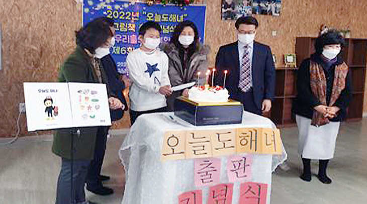(재)김녕행복한지역아동센터(센터장 김형자)는 최근 센터 설립14주년을 맞이해 유네스코 무형문화유산에 등재된 제주해녀문화와 자신이 살고 있는 마을에 대한 자긍심을 가질 수 있도록 ‘오늘도 해녀’ 그림책 만들고 출판 기념식을 진행했다.