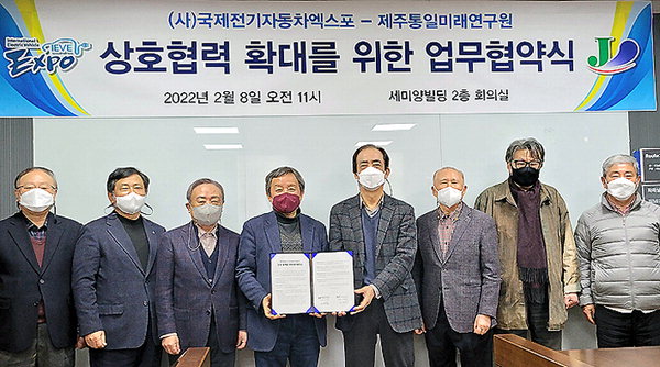사)국제전기자동차엑스포(이하 IEVE)와 제주통일미래연구원(이하 연구원)은 8일 오전 제주첨단과학기술단지에 있는 세미양빌딩에서 '남북 평화협력 및 산업·학술교류 확대를 위한 업무협약'을 체결했다고 9일 밝혔다.