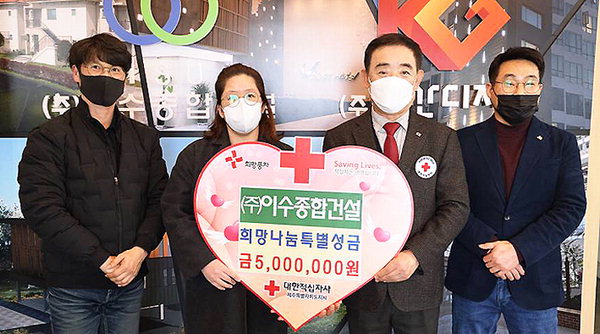 (주)이수종합건설(대표이사 강성부)은 지난 9일 이수종합건설 사무실에서 대한적십자사제주특별자치도지사(회장 오홍식)에 소외된 이웃을 위한 희망나눔 특별성금 500만원을 기탁했다.