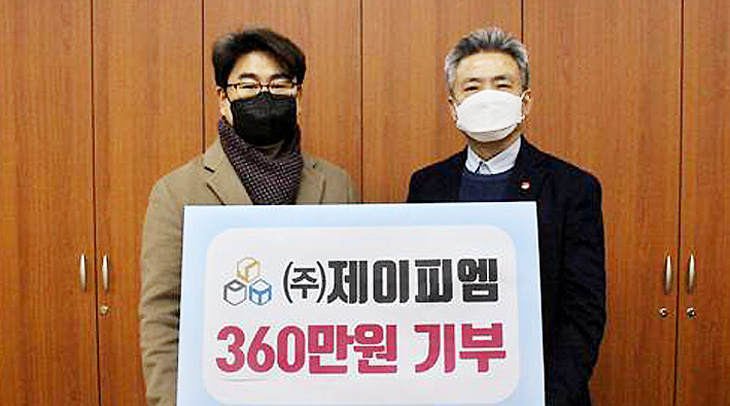 ㈜제이피엠(대표이사 강미란)은 지난 22일 제주특별자치도자원봉사센터(센터장 고태언)를 통해 찾아가는 맞춤형 자원봉사사업을 위한 기부금 360만원을 전달하였다. 기부금은 제주지역의 취약계층을 위한 집수리에 쓰여질 예정이다.