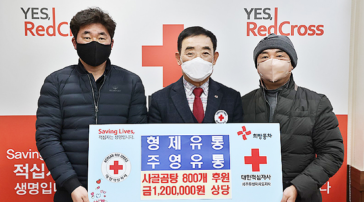형제유통(대표 김상훈)과 주영유통(대표 현봉석)은 지난 22일 대한적십자사제주특별자치도지사(회장 오홍식)를 방문해 취약계층 지원을 위한 사골곰탕 800개(120만원 상당)를 기탁했다.