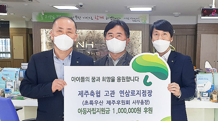 제주축협 연삼로지점 고관 지점장은 지난 22일 초록우산 어린이재단 제주지역본부(본부장 김희석)에 후원금 100만원을 전달했다. 후원금은 아동복지시설에서 퇴소하는 아동들의 자립지원비용으로 사용될 예정이다.