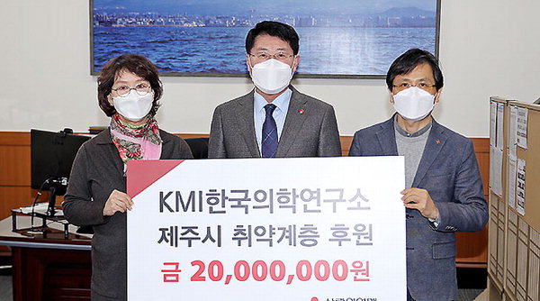 KMI한국의학연구소(이사장 김순이)는 24일 제주시청 시장 집무실을 방문해 성금 2000만원을 기탁했다. 이번에 기탁된 성금은 사회복지공동모금회로 지정기탁돼 제주시 관내 저소득 위기가구 긴급 지원 의료비로 지원될 예정이다.