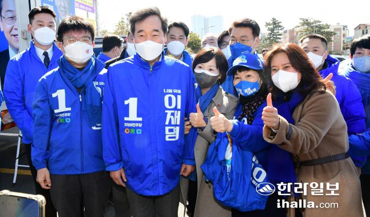 27일 더불어민주당 이낙연(왼쪽에서 세번째) 총괄선대위원장이 제주시 민속오일시장에서 이재명 대선 후보 지원 유세를 하고 있다. 강희만기자
