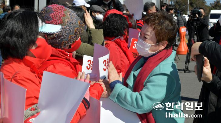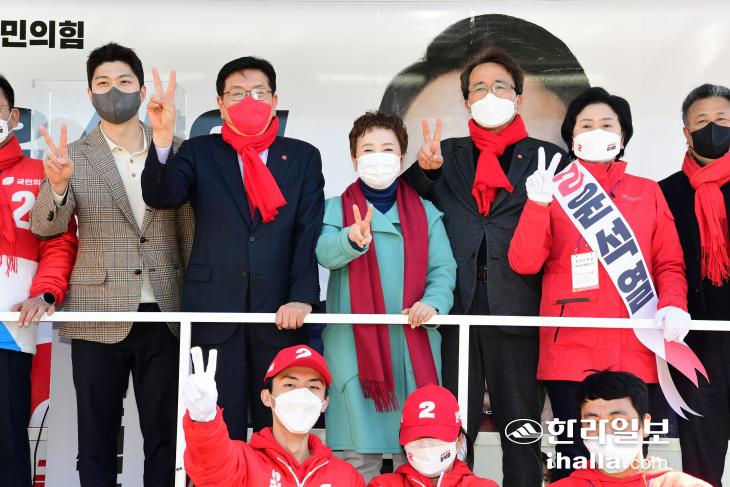 국민의힘 김용태(사진 왼쪽), 정미경(왼쪽에서 세번째) 최고위원이 27일 제주를 찾아 같은 당 소속 윤석열 대선 후보에 대한 지지를 호소했다. 강희만기자