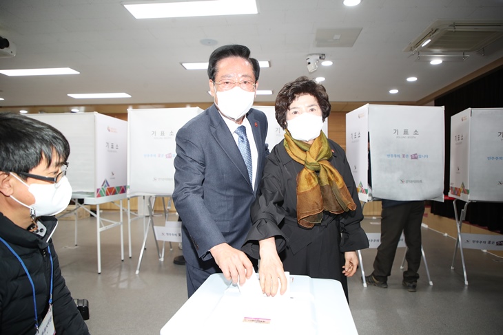 4일 오전 제주도의회 의원회관에 마련된 사전투표소에서 투표하는 좌남수 제주자치도의장 부부. 제주도의회 제공
