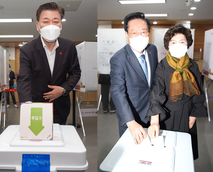 구만섭 제주특별자치도지사 권한대행과 좌남수 제주특별자치도의회의장 내외가 4일 제주도의회 의원회관에 마련된 사전투표소에서 투표하고 있다. 제주도·제주도의회 제공