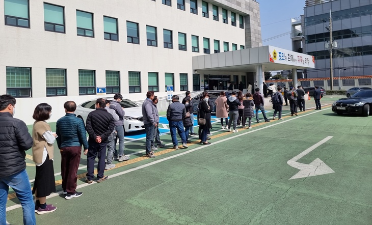 제20대 사전투표일인 4일 투표하기 위해 길 줄 선 유권자.