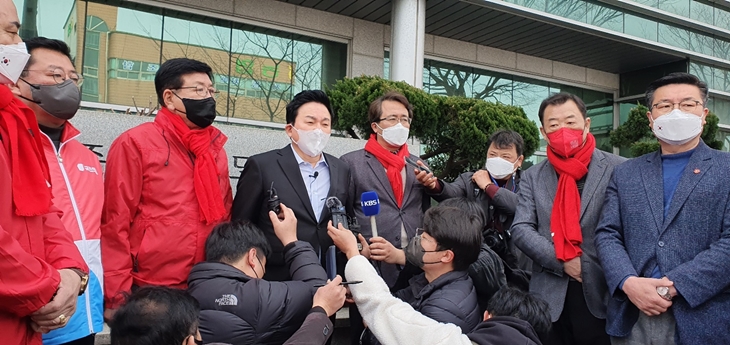 원희룡 국민의힘 중앙선거대책본부 정책총괄본부장이 7일 사전 투표 관리 부실에 대한 책임을 묻기 위해 제주도선거관리위원회를 항의 방문한 직후 기자들과 만난 자리에서 질문에 답변하고 있다.