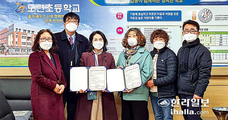 도련초등학교(교장 조미영)는 지난 7일 교장실에서 삼양동 청소년지도협의회(회장 이경희)와 학교폭력 예방과 근절을 위한 학교-지역사회의 유기적인 연계 지도 체계 마련 네트워크 협약서를 체결했다.