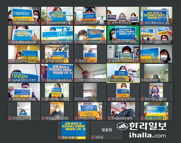 YWCA제주도협의회(회장 고맹수)가 3·8 세계여성의날을 맞아 8일 제주YWCA와 서귀포YWCA 회원과 활동가 40여 명이 참여하는 '대선 정책 제안과 우크라이나 전쟁 반대 여성평화 시위'를 온라인으로 진행했다.