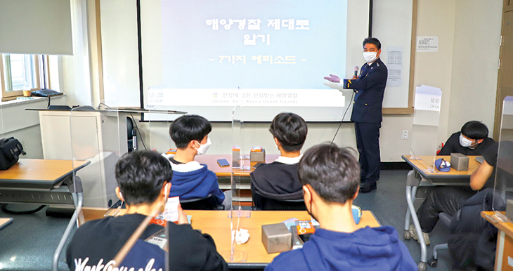제주지방해양경찰청은 지난 14일 제주대학교에서 해양산업경찰학과 재학생을 대상으로 ‘해양경찰 제대로 알기 7가지 에피소드’라는 주제로 진로 특강을 진행했다.
