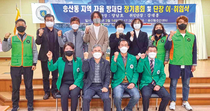 송산동지역자율방재단(단장 강대흥)은 지난 14일 주민센터 회의실에서 2022년 정기총회를 갖고 강대흥 단장 등 신임 임원진을 선출하는 한편 단장 이·취임식을 개최했다.