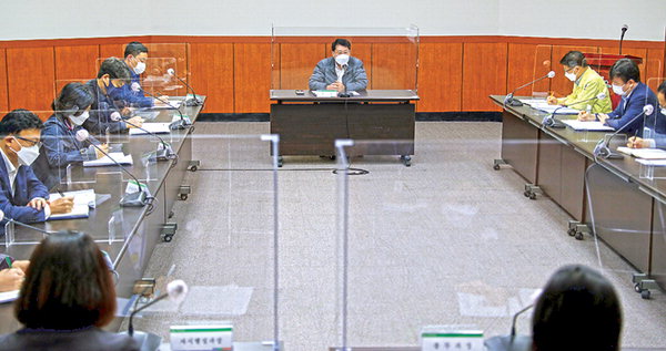 안동우 제주시장은 16일 각 국장 등이 참여한 가운데 제주시청 본관 회의실에서 주간 간부회의를 주재했다. 이 자리에서 안 시장은 코로나19 생활지원비 지급, 들불축제 취소 후속 조치, 예산 신속집행 등에 대해 보고 받고 이에 대한 대책을 논의했다.