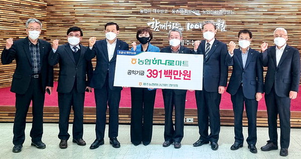 제주농협 하나로마트협의회(회장 차성준 한림농협 조합장)는 16일 농협제주지역본부에서 지난해 도내 하나로마트가 조성한 공익기금 3억9100만원을 제주사회복지공동모금회(회장 강지언)에 기탁했다.