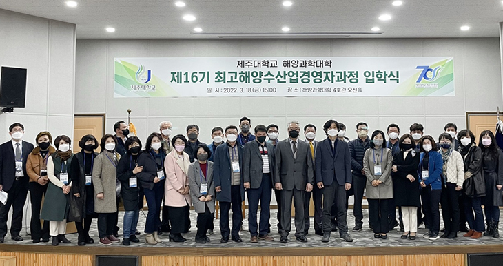 제주대학교 해양과학대학(학장 조은일)은 지난 18일 해양과학대학 4호관 오션홀에서 '2022학년도 제16기 최고해양수산업경영자과정 입학식'을 개최했다.