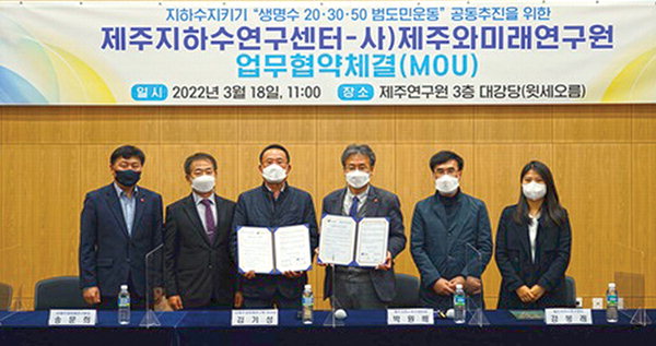 제주연구원 제주지하수연구센터(센터장 박원배)와 (사)제주와미래연구원(이사장 김기성)은 지난 18일 제주지하수연구센터에서 업무 협약식을 갖고 지하수를 보전하기 위한 '생명수20·30·50 범도민 운동'을 공동 추진하기로 했다.