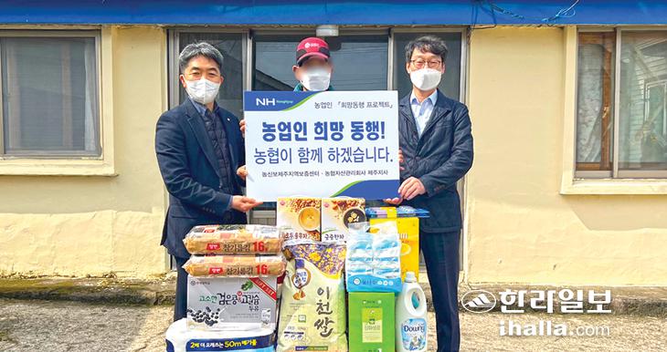 농협자산관리회사 제주지사(지사장 이원휴)와 농림수산업자 신용보증 기금 제주지역보증센터(센터장 변영종)는 22일 서귀포시 성산읍에서 '농업인 희망동행 프로젝트'를 합동으로 실시했다. 이 프로젝트는 농업인 신용회복 컨설팅을 통해 신용 회복한 농업인을 대상으로 농협자산관리회사가 범농협과 함께 재기 의지를 북돋아주는 프로젝트다. 지원 대상으로 선정된 농업인은 과거 농업에 종사하면서 농신보 보증으로 운영자금을 지원받았으나, 연이은 흉작으로 과도한 채무를 감당하지 못하게 됐고 이번 신용회복 컨설팅을 통해 이자 전액과 원금 일부를 감면받아 채무를 종결했다.