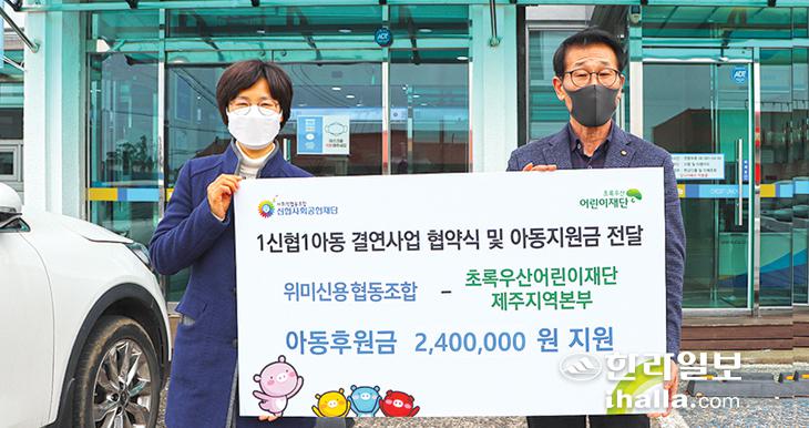 위미신용협동조합(이사장 고창세)은 지난 21일 초록우산 어린이재단 제주지역본부와 함께 진행하는 '1신협1아동 결연사업'에 동참하고 협약 및 후원금 전달식을 진행했다.
