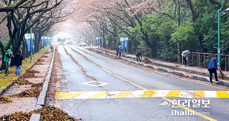 제주시 아라동과 아라동새마을부녀회(회장 김순란)는 지난 26일 공무원과 부녀회원 30여 명이 참여한 가운데 강풍에 따른 제주대 벚꽃거리 환경정비를 실시했다.