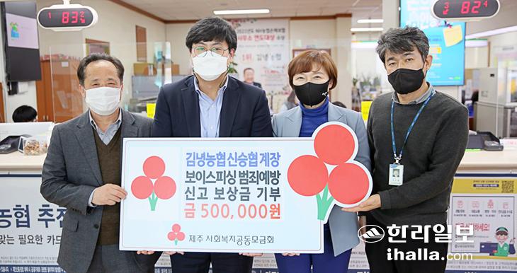 김녕농협 신승협 계장은 지난 28일 김녕농협에서 보이스피싱 범죄예방 신고 보상금 50만원을 제주사회복지공동모금회에 기탁했다. 이번 성금은 신 계장이 지역주민의 1900만 원 규모 보이스피싱 사고를 예방해 제주동부경찰서로부터 받은 보상금이다. 신 계장은 "보상금을 좀 더 의미있게 사용해보자는 생각에 기부를 결심했다"고 말했다.