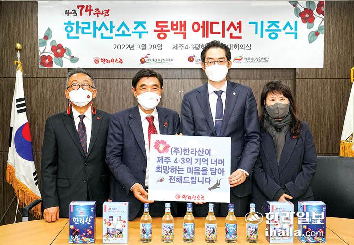 제주대표 향토기업 (주)한라산소주(대표이사 현재웅)가 제주4·3 74주년을 맞아 '한라산 동백 에디션'을 출시하고 4·3희생자유족회와 4·3평화재단에 기증했다.