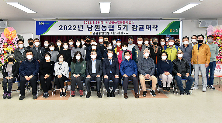 남원농협(조합장 김문일)은 지난달 29일 남원농협 유통사업소에서 '2022년 남원농협 5기 감귤대학 개강식'을 개최했다. 교육은 오는 11월까지 도내외 전문강사의 강의로 자기계발과 개인역량강화 등 교양 과정, 산업별 전문기술교육, 품질 향상, 성공전략, 기후변화 대응 교육과 도내 우수농가 현장학습 과정으로 운영된다.