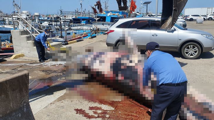 지난 8일 마라도 남쪽 70㎞ 해상에서 발견된 4m 길이의 밍크고래를 해경대원들이 채증하고 있다. 제주해양경찰서 제공