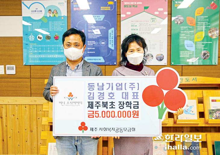 동남기업(주) 김경호 대표는 최근 제주북초등학교(교장 홍미옥)를 방문해 어려운 학생들을 위해 사용해달라며 제주사회복지공동모금회(회장 강지언)와 함께하는 아너 소사이어티 장학금 500만원을 전달했다.