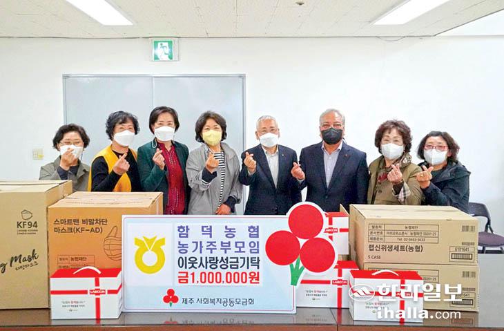 함덕농협 농가주부모임(회장 양기생)은 지난 8일 함덕농협에서 도내 어려운 이웃을 위해 사용해 달라며 성금 100만원과 마스크 3000개, 위생용품세트 17박스를 제주사회복지공동모금회에 기탁했다.
